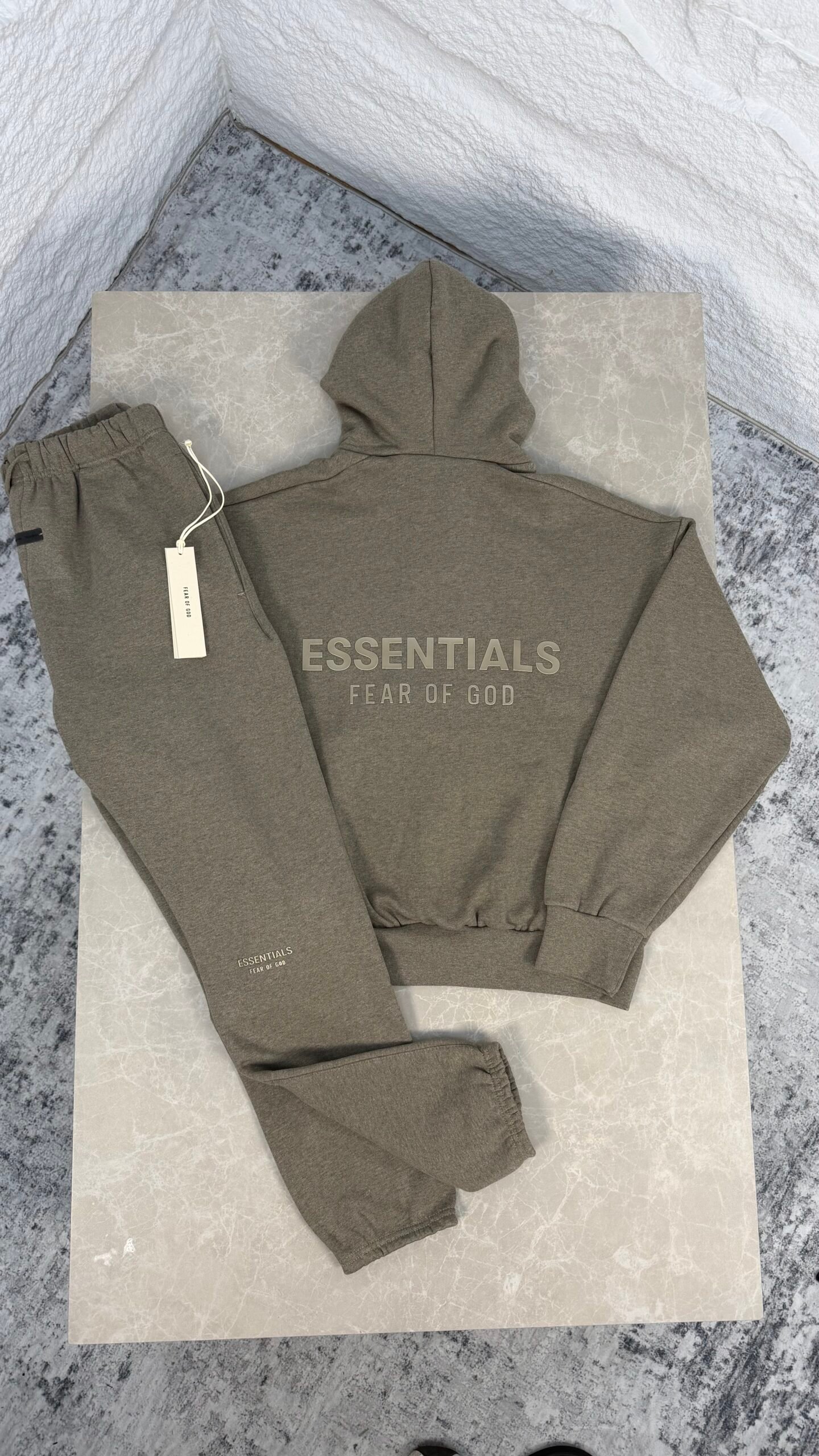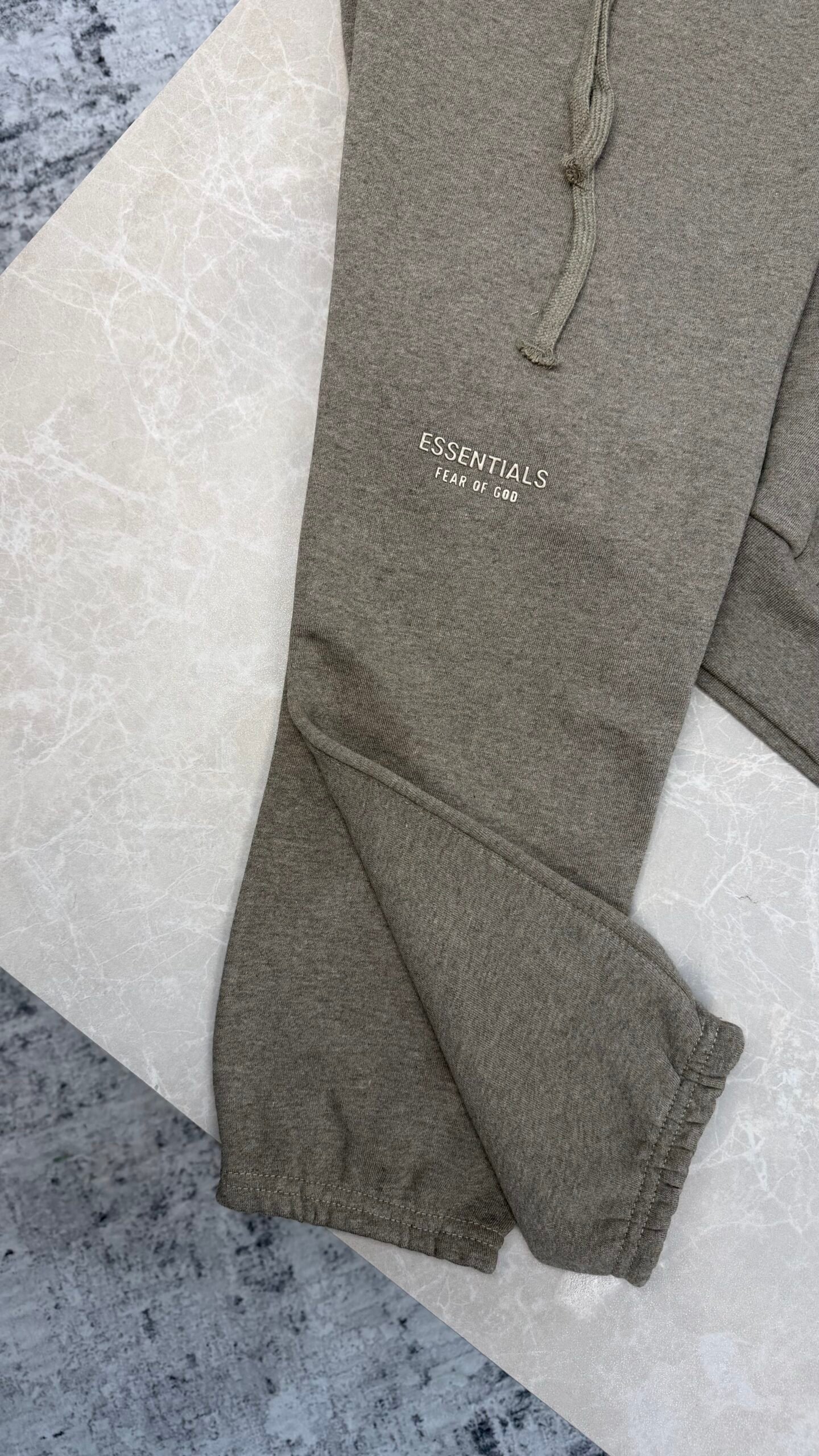 Ensemble Fear of God Essentials en molleton 380 g/m², offrant confort et coupe optimale. Le hoodie adopte une coupe classique avec proportions relaxées, capuche double couche, poche kangourou, manches et bas côtelés, et logo Essentials métallique incliné au dos. L’ensemble inclut également un pantalon assorti pour un look coordonné et moderne.