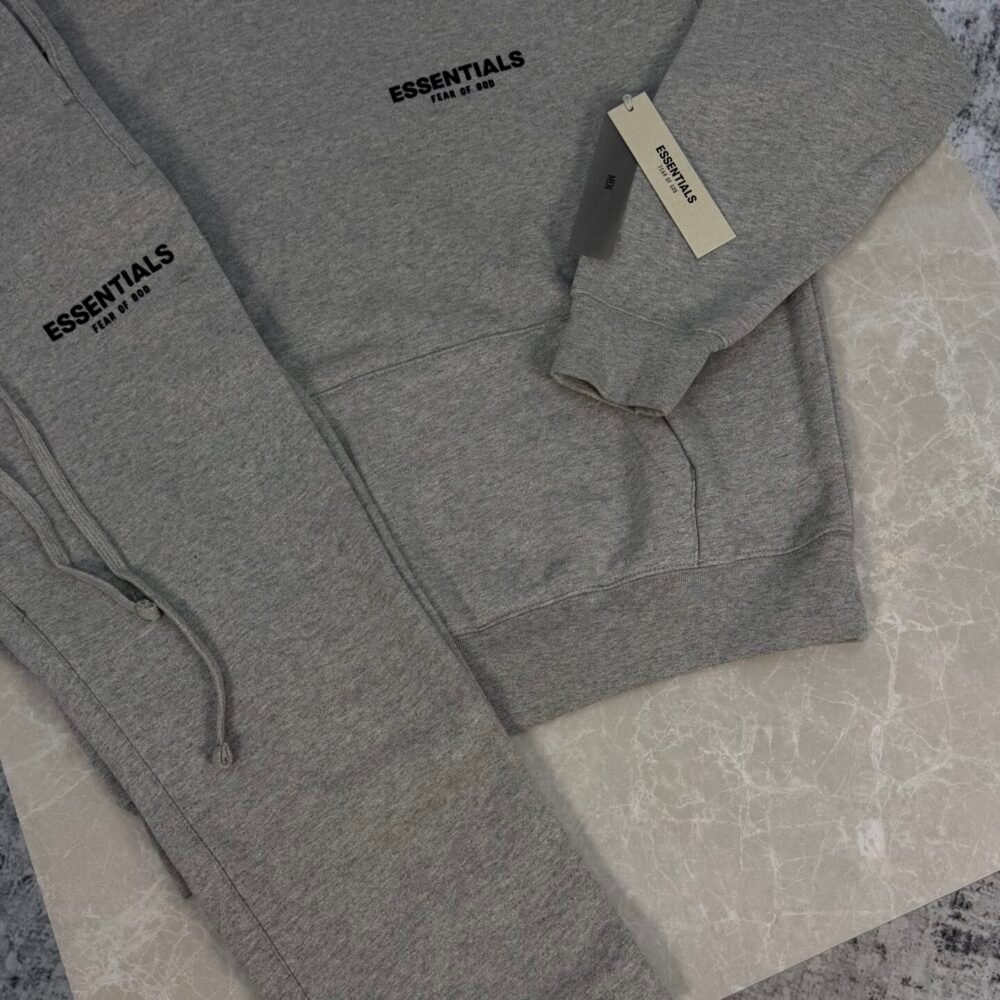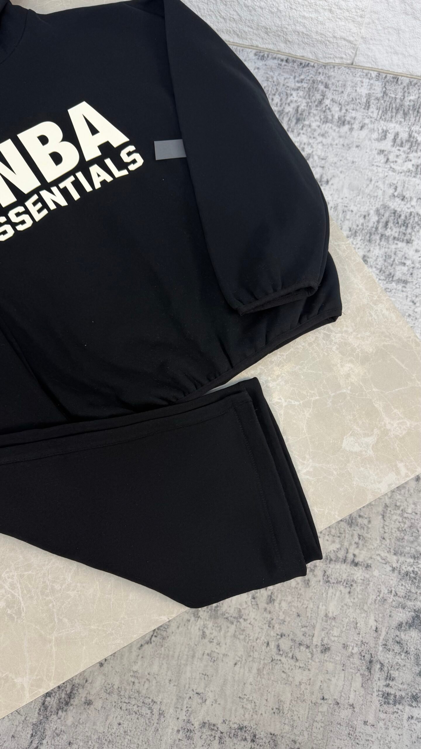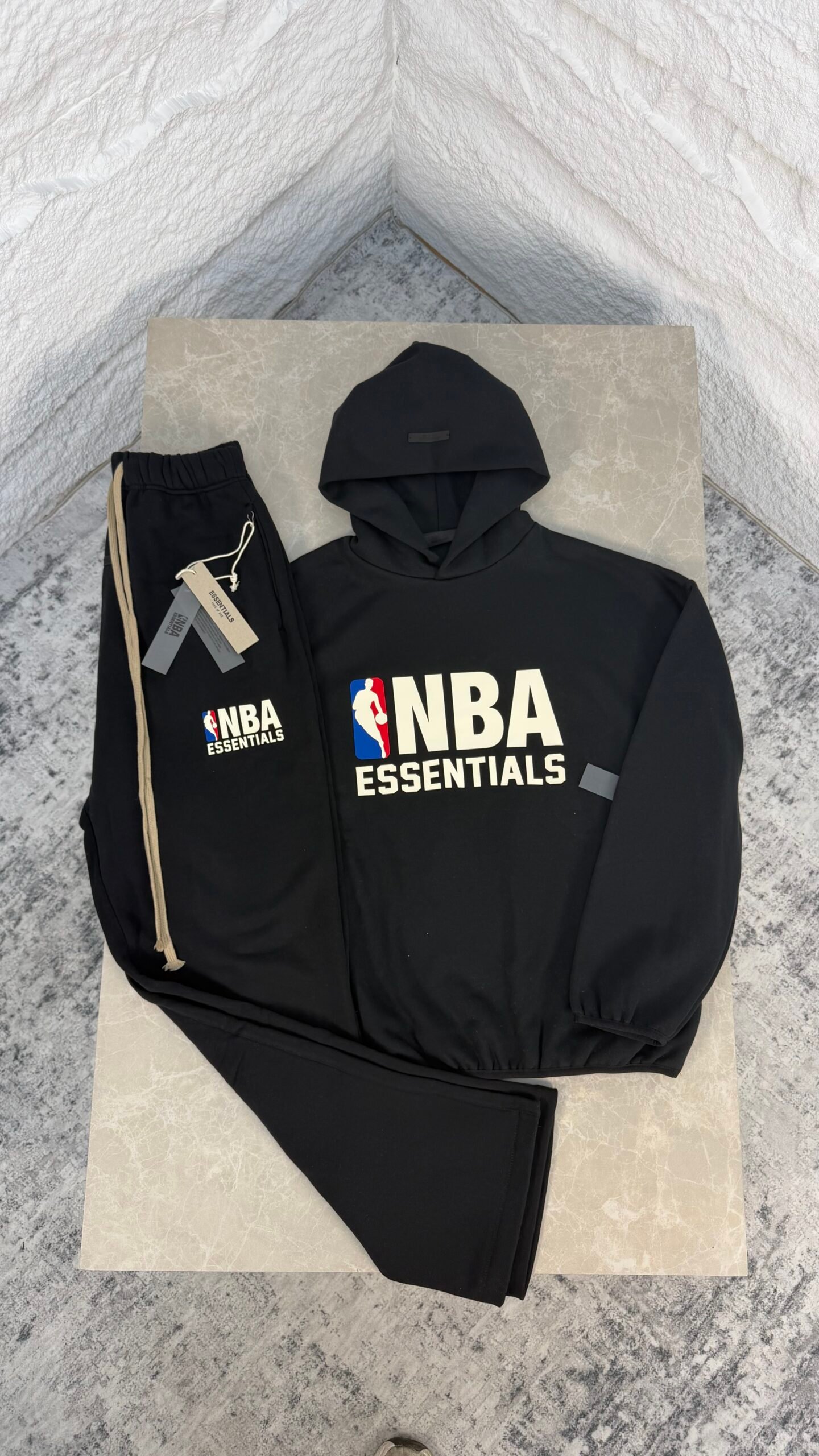 Ensemble Fear of God Essentials × NBA, alliant confort et style urbain. Confectionné en molleton 380 g/m², il comprend un hoodie à capuche avec poche kangourou, manches et bas côtelés, et un pantalon assorti pour un look coordonné. Le hoodie arbore le logo Essentials incliné au dos et la signature NBA, apportant une touche sportive iconique à cette silhouette moderne et décontractée. Parfait pour un style streetwear sophistiqué au quotidien.