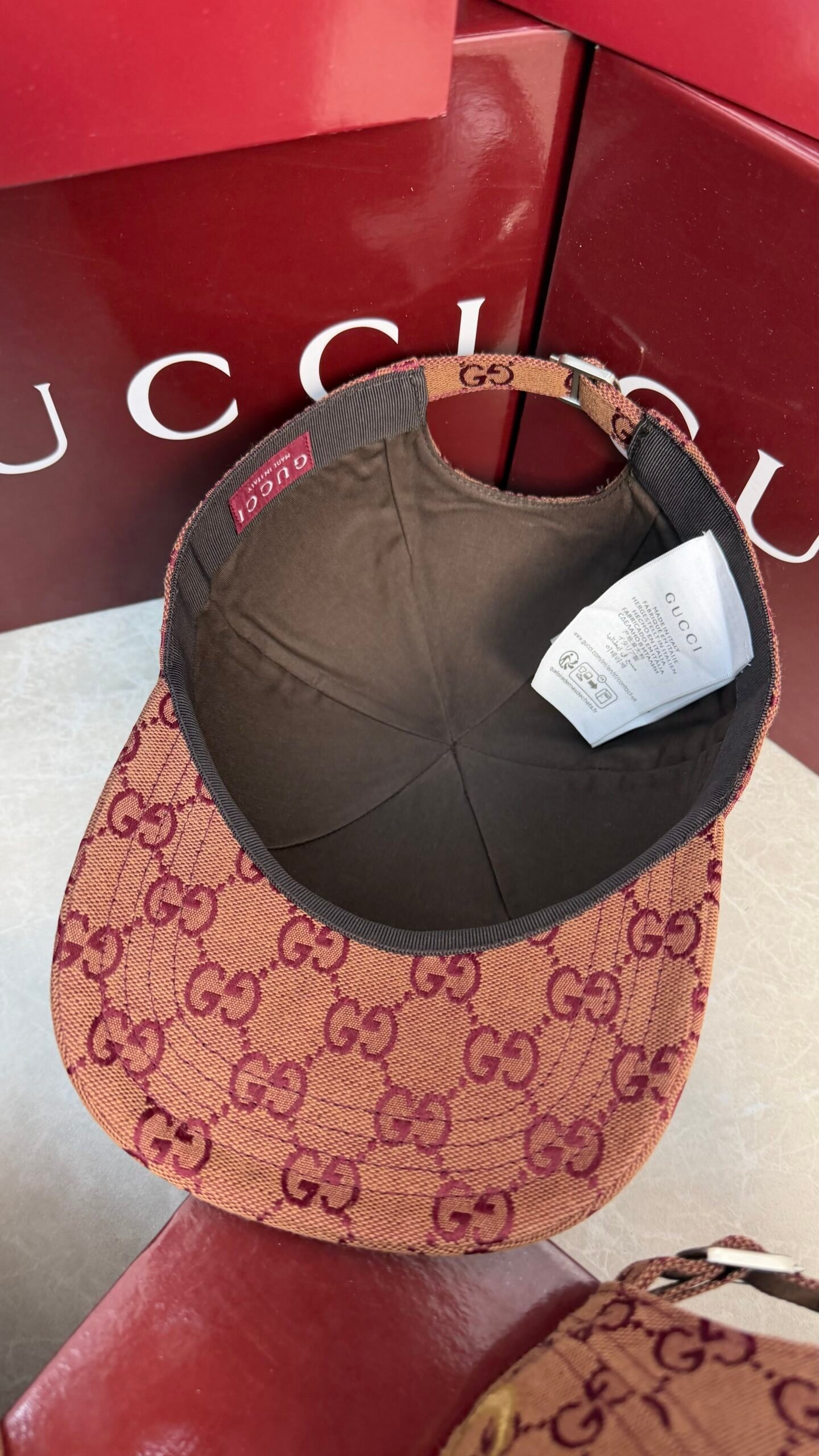Casquette Gucci en toile rose, subtilement structurée, mêlant élégance contemporaine et touche féminine, avec fermeture réglable pour un ajustement parfait.