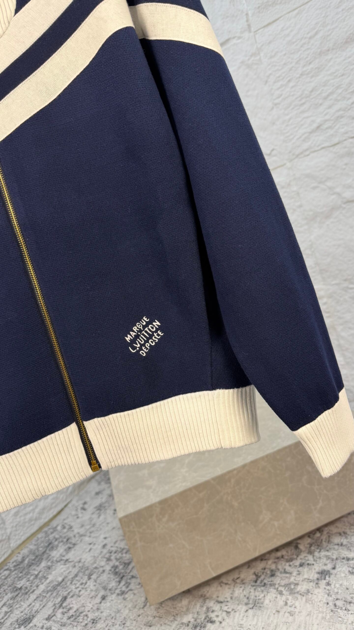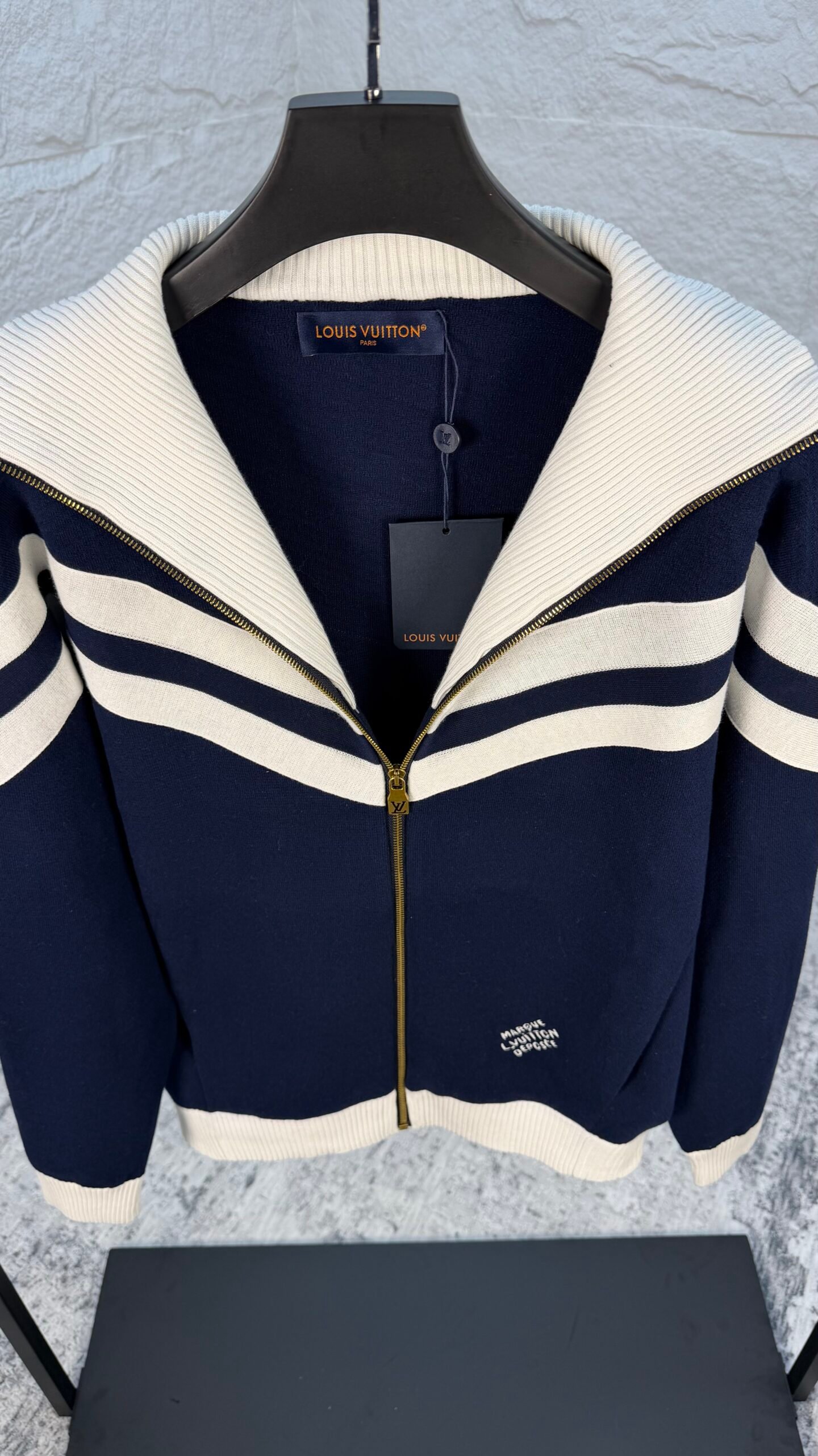Blouson nautique en maille de coton, revisitant l’esprit sportif avec des détails raffinés. Bandes blanches inspirées des uniformes marins, épaules en jacquard texturé effet Épi, col haut côtelé et signature brodée contrastée pour une allure élégante et décontractée.