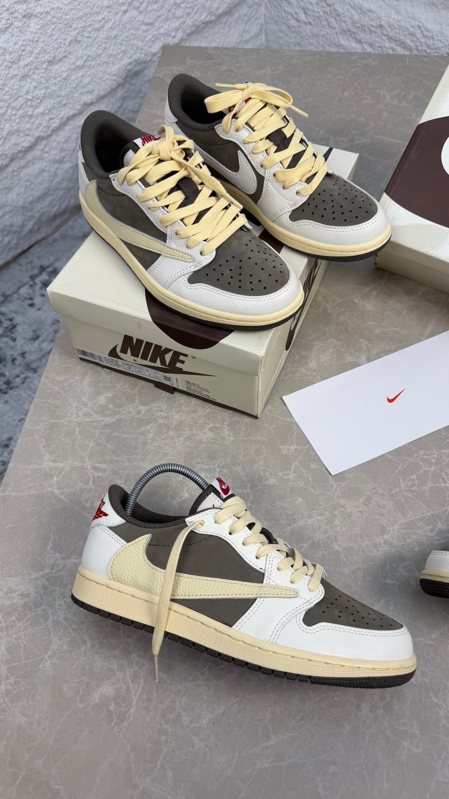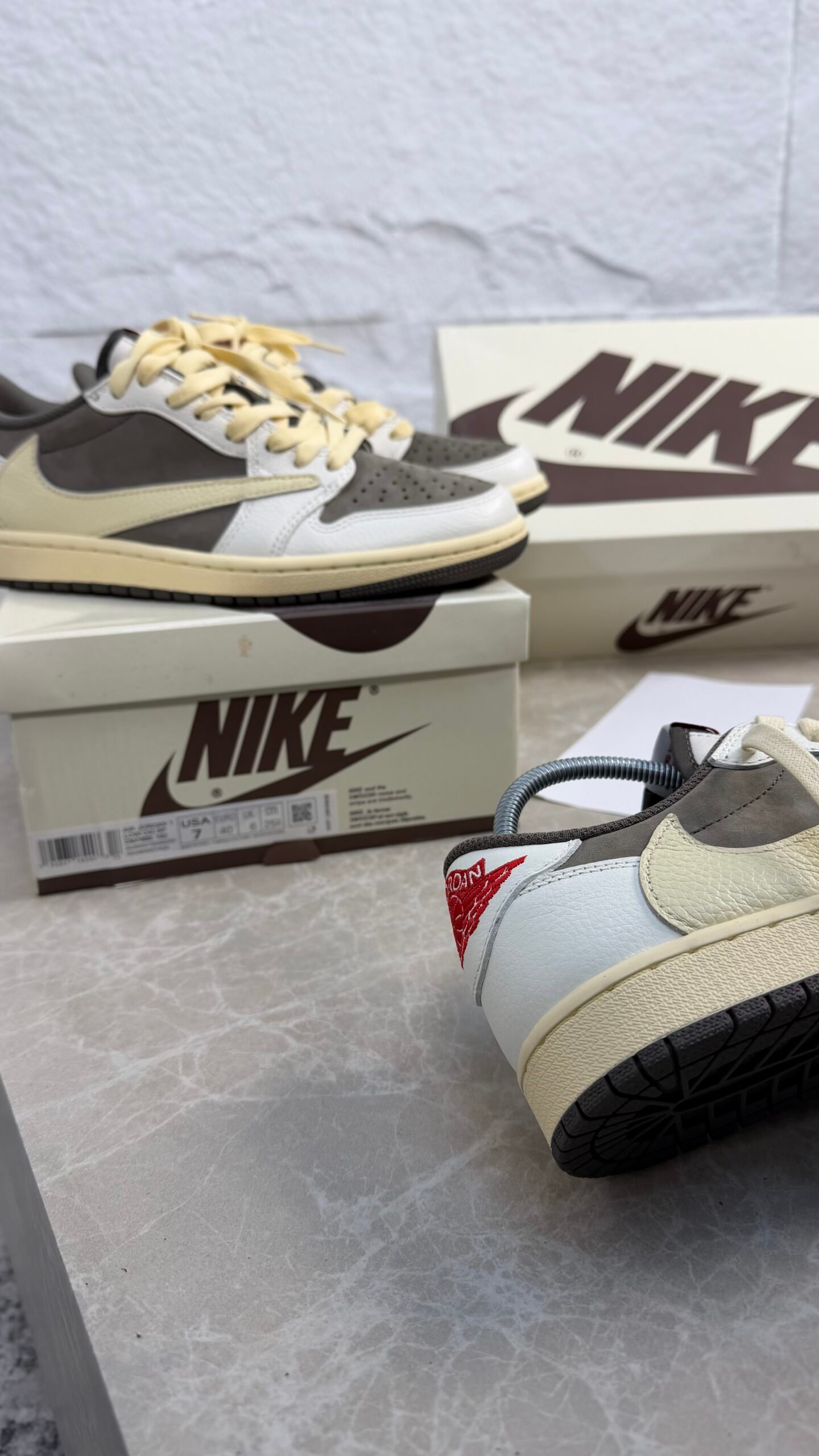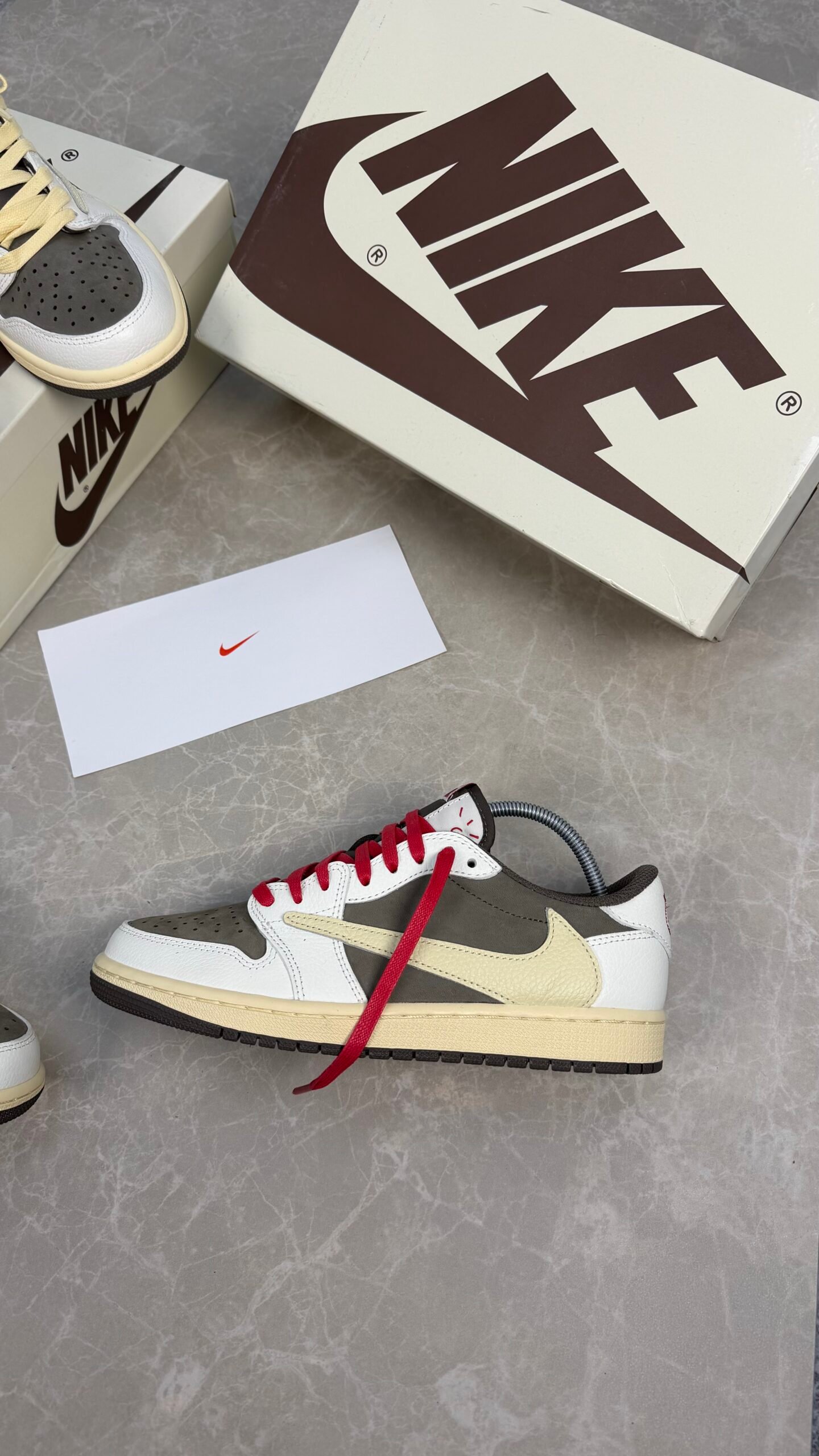 Les Travis Scott x Air Jordan 1 Low OG Reverse Mocha revisitent l’iconique Air Jordan 1 Low avec une palette inversée inspirée du modèle Mocha. Cette collaboration se distingue par le swoosh inversé, des détails premium en cuir et nubuck, et une silhouette basse au style streetwear résolument contemporain.