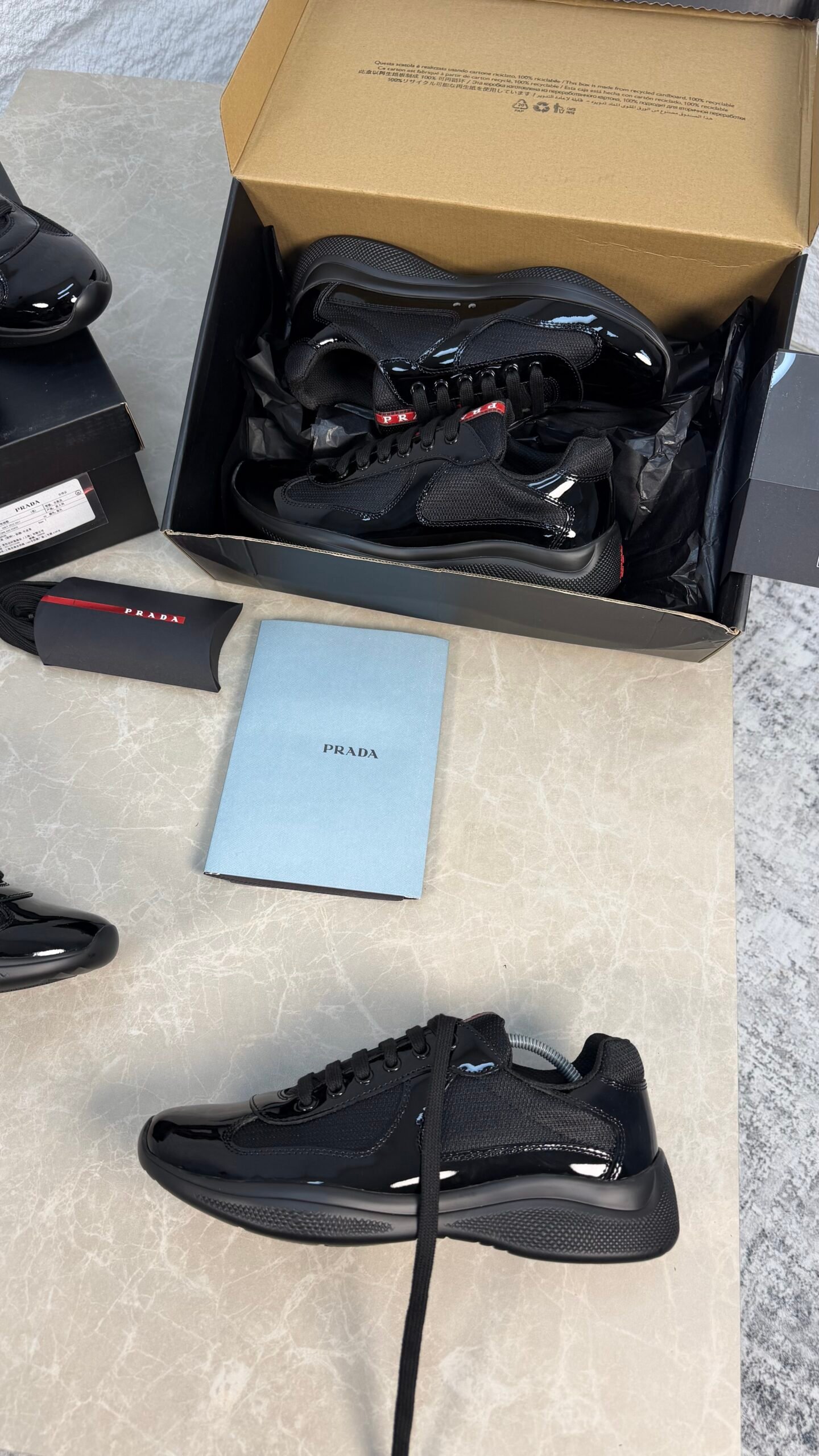 Ces sneakers Prada associent cuir verni et empiècements en tissu Bike, avec le logo Linea Rossa sur la languette et la semelle pour un style emblématique.