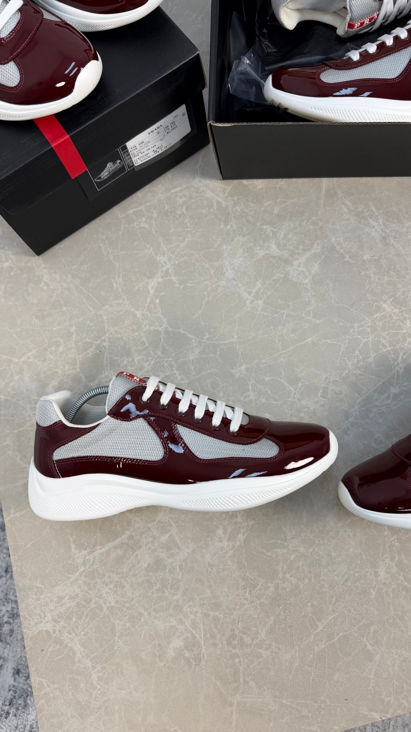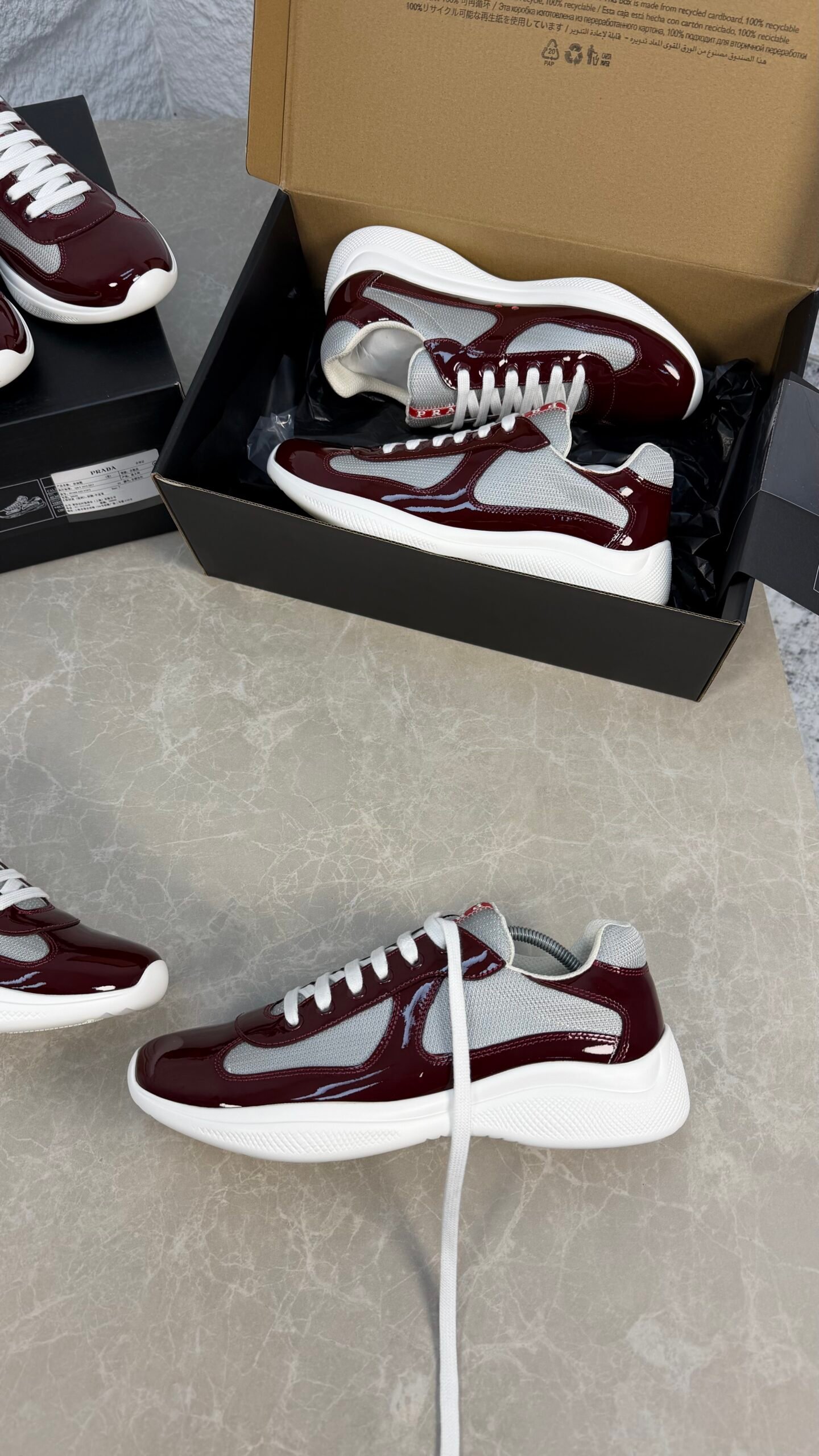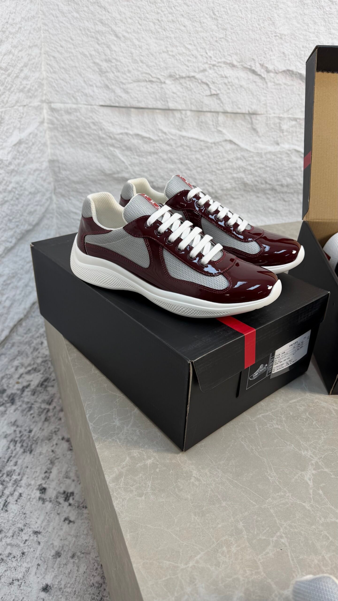 Ces sneakers Prada associent cuir verni et empiècements en tissu Bike, avec le logo Linea Rossa sur la languette et la semelle pour un style emblématique.